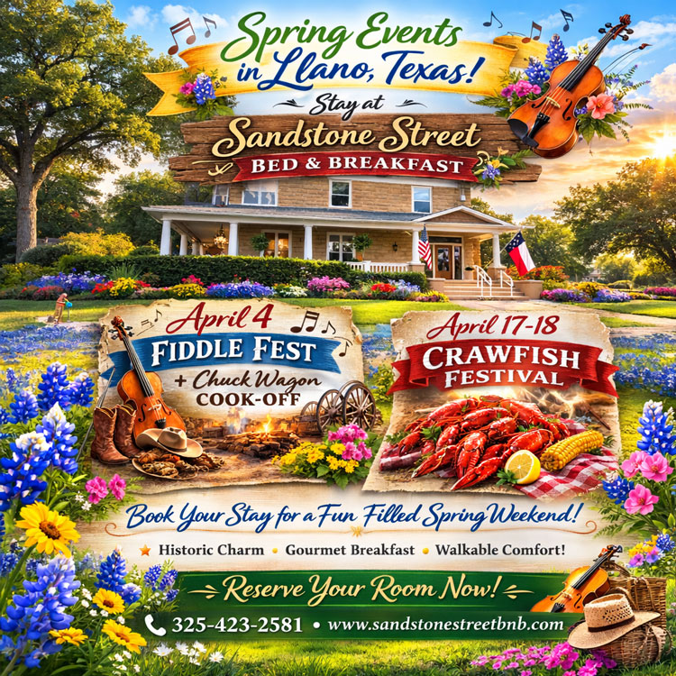 Events at the B&B Cooking Classes, Art Classes, Annual Christmas Tea.Be sure to check out the rich history of our bed and breakfast as well as media mentions. BOOK NOW CHECK AVAILABILITY Make Reservation Spring Events in Llano, Texas! Stay At Sandstone Street Bed & Breakfast April 4th Fiddle Fest + Chuck Wagon Cook-off April 17th-18thCrawfish Festival Book Your Stay for a Fun Filled Weekend!Historic Charm – Gourmet Breakfast – Walkable Comfort! Reserve Your Room Now! 325-423-2581 – www.sandstonestreetbnb.com